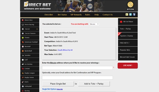 DirectBet offers an online betting platform that accepts cryptocurrency live bet types for sports betting, horse racing, dice, and even poker.